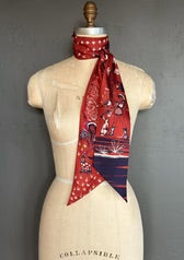 Western whimsy meets feminine flair. The Cactus Kate Silky in Peaches features a bold desert scene filled with cowgirls, cacti, and playful prairie icons—all in rich red and peach tones with hints of navy. Crafted from smooth, lightweight silk, this scarf ties effortlessly at the neck, wrist, or on your favorite hat or bag.