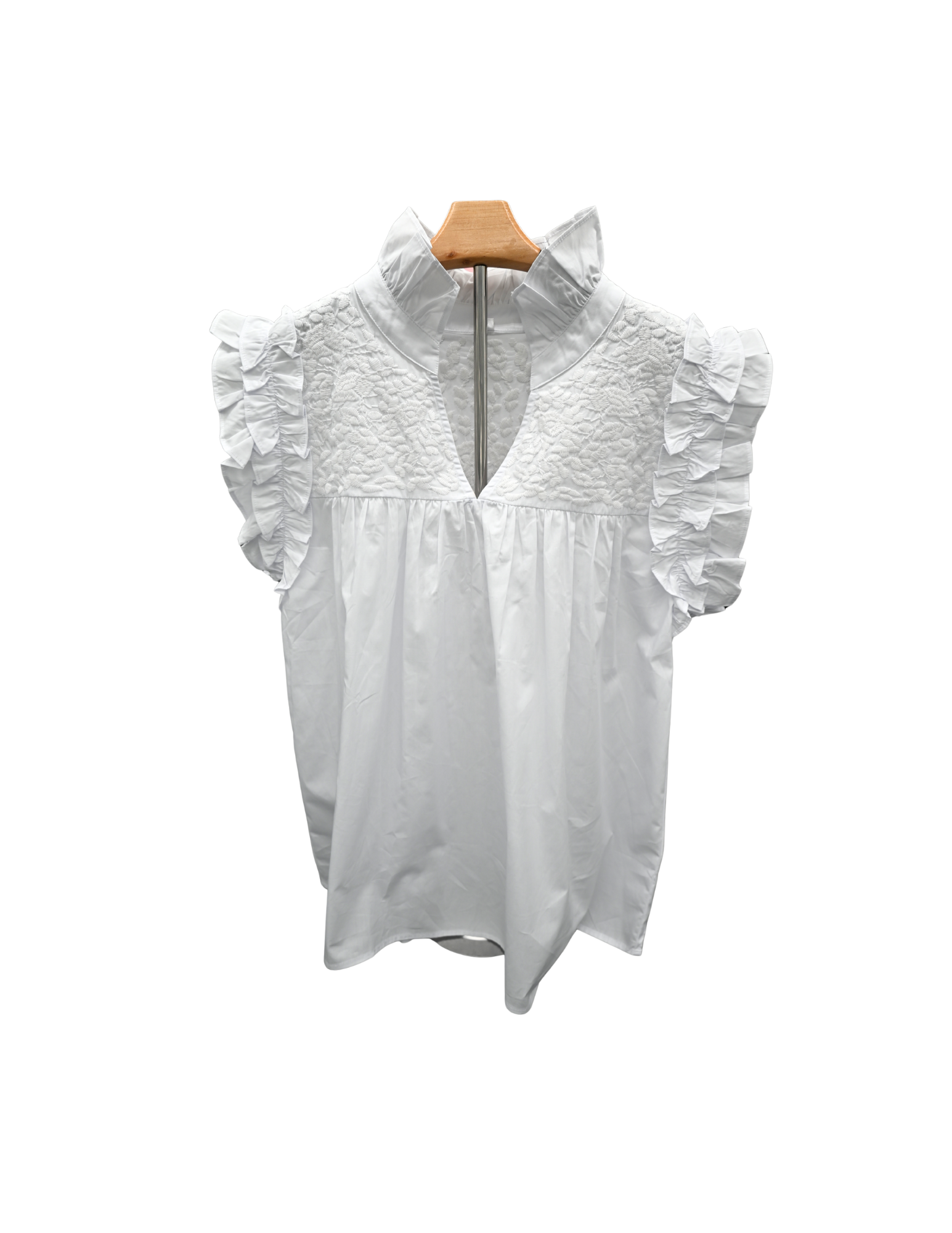The Double White Hummingbird Blouse is sleeveless blouse featuring intricate Mexican embroidery across the chest and a softly gathered silhouette that flatters without fuss. Finished with delicate ruffle details and a high neckline, it’s a romantic take on a timeless classic—perfect for warm days and layered looks.