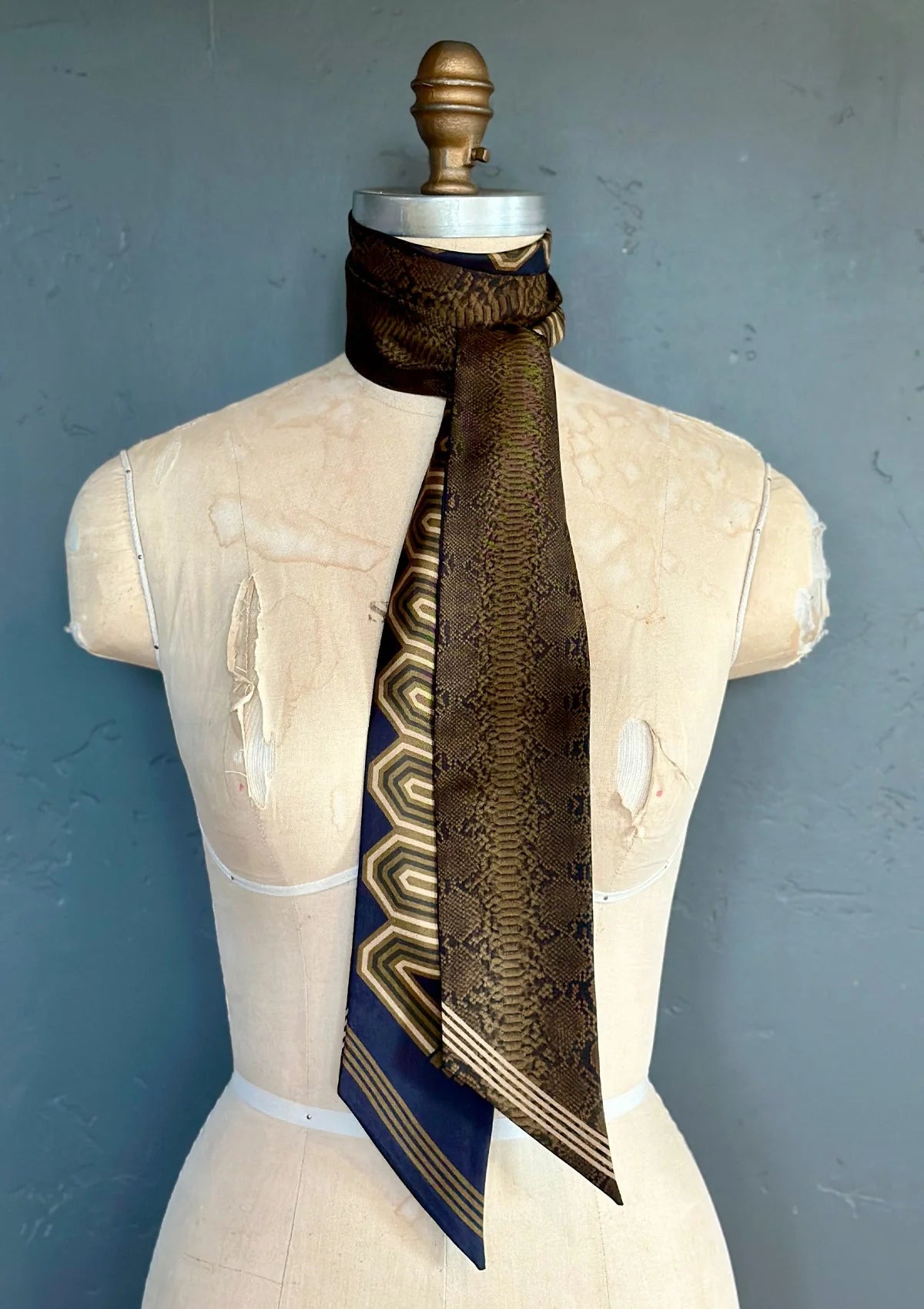 Striking and sophisticated, the Eden Python Twilly in Ink & Olive blends bold geometry with earthy elegance. Featuring a stylized python pattern in deep navy, olive, and gold tones, this double-sided silk scarf delivers subtle drama and versatile styling options.