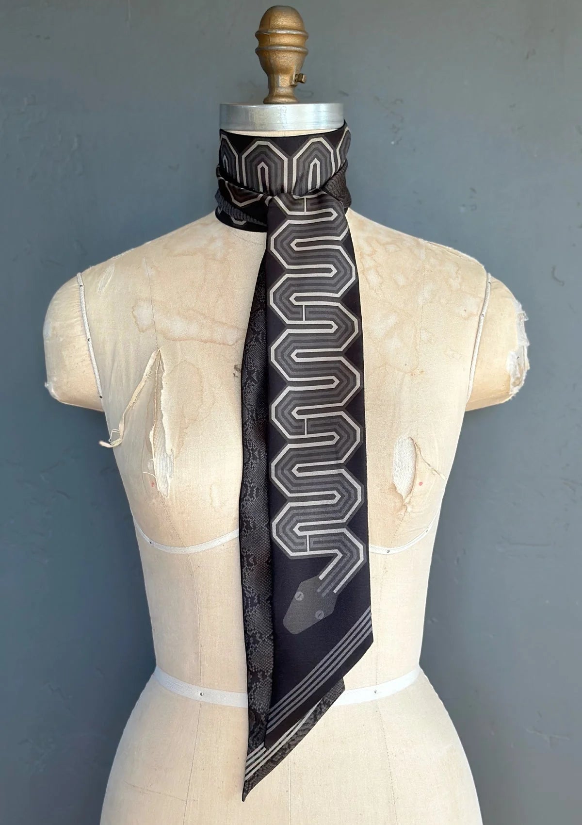 Sharp, sleek, and endlessly versatile. The Eden Python Twilly in Obsidian Grey brings modern edge to classic silk. Featuring a stylized snake motif in a striking monochrome palette, this scarf adds a bold accent to any look—whether tied at the neck, wrapped around the wrist, or styled on a hat or bag.