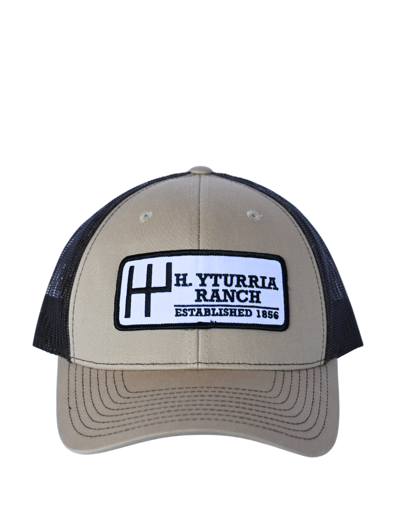 Classic ranch style with everyday function. This tan and black trucker cap features a bold embroidered patch showcasing the H. Yturria Ranch logo and its founding year, 1856. The breathable mesh back and structured front make it a reliable choice for sunny days and long hauls.