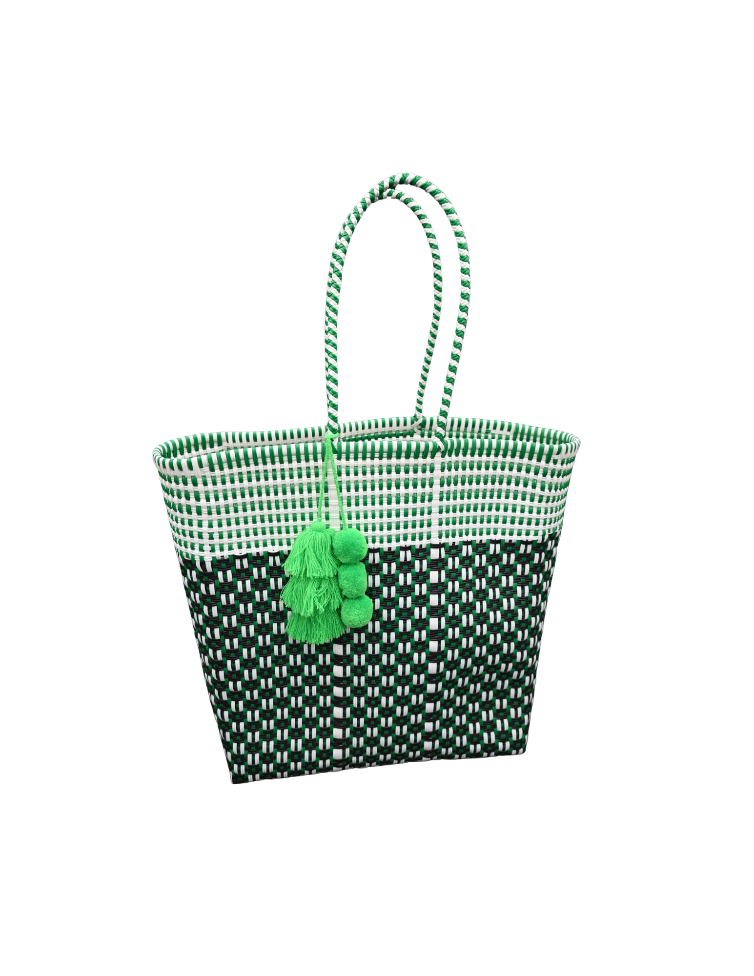Functional, stylish, and eco-conscious. This vibrant market tote is handwoven in Progreso, Mexico from recycled plastic, making it both durable and sustainable. Featuring a bold check pattern in fresh green and white with a playful pop of color from matching green tassels, it's the perfect companion for beach days, farmers markets, or everyday errands.