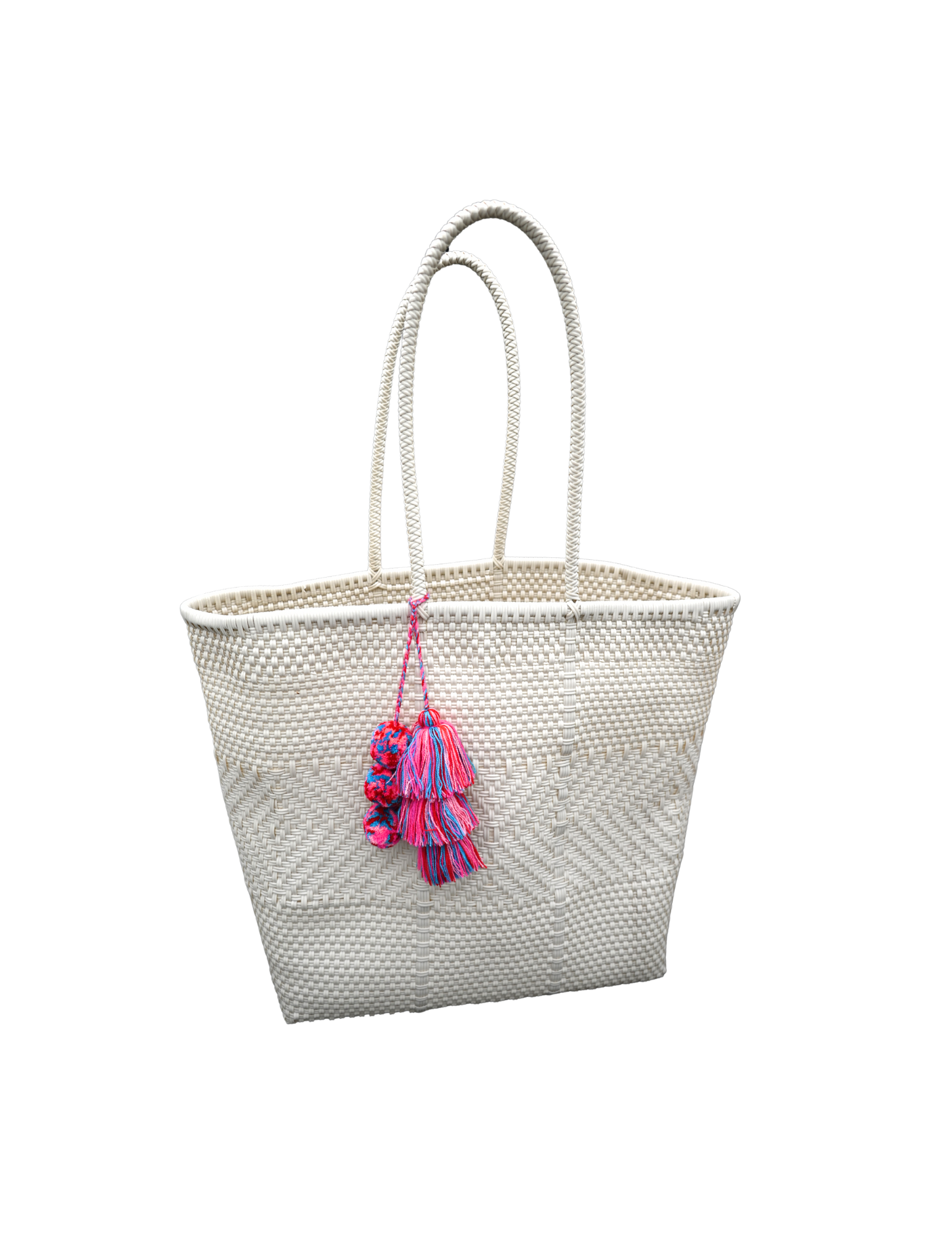Functional, stylish, and eco-conscious. This elegant market tote is handwoven in Progreso, Mexico from recycled plastic, making it both durable and sustainable. Featuring a clean white chevron pattern with a playful pop of color from pink and purple tassels, it's the perfect companion for beach days, farmers markets, or everyday errands.