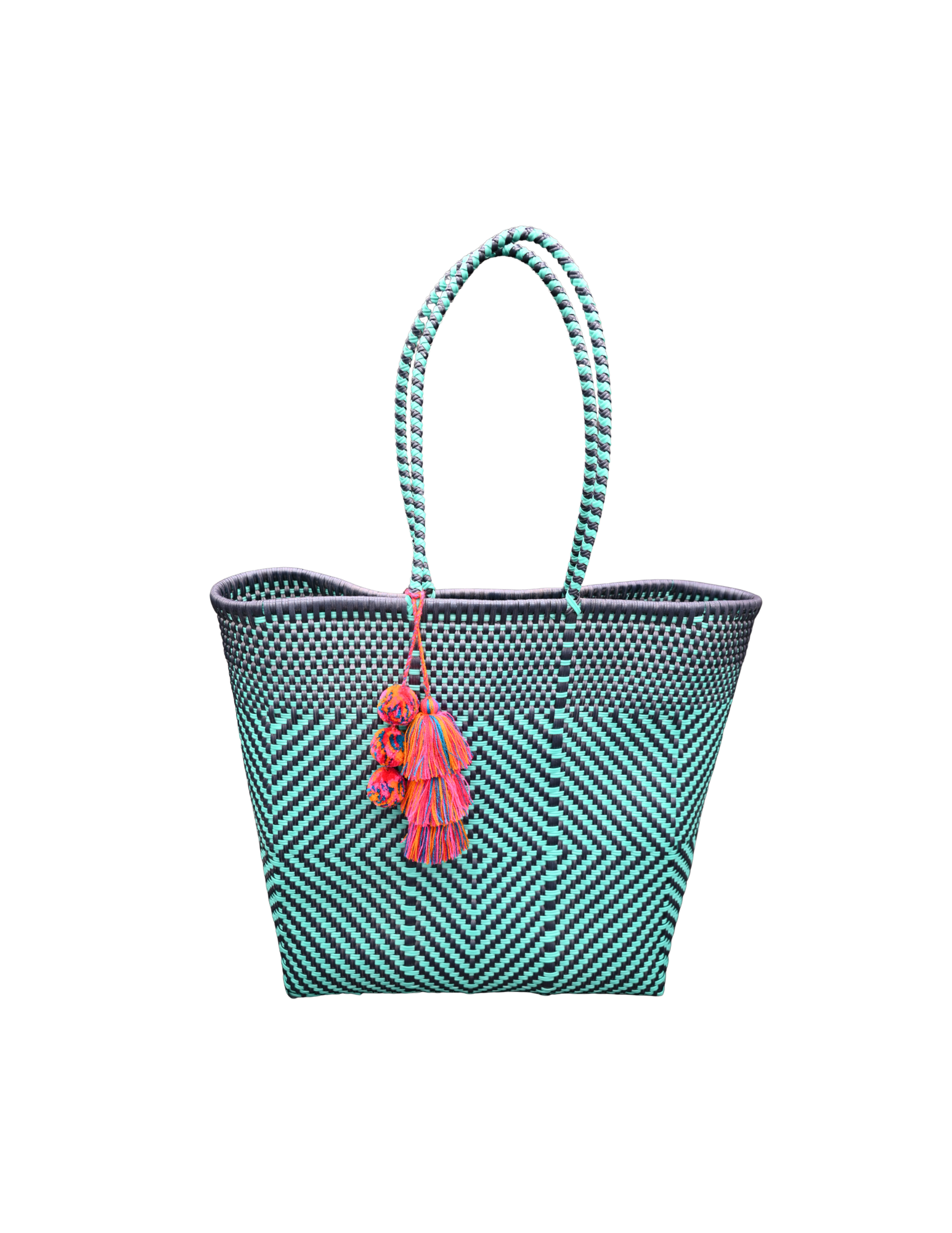 Functional, stylish, and eco-conscious. This vibrant market tote is handwoven in Progreso, Mexico from recycled plastic, making it both durable and sustainable. Featuring a bold chevron pattern in turquoise and black with a playful pop of color from multicolor tassels, it's the perfect companion for beach days, farmers markets, or everyday errands.