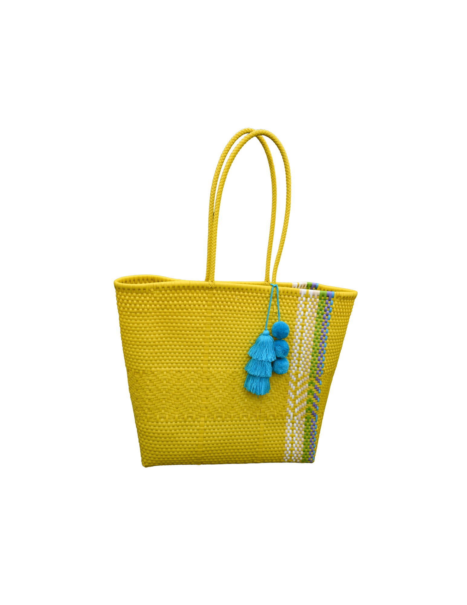 Functional, stylish, and eco-conscious. This vibrant market tote is handwoven in Progreso, Mexico from recycled plastic, making it both durable and sustainable. Featuring a sunny yellow base with subtle white striping and a bright pop of color from light blue tassels, it's the perfect companion for beach days, farmers markets, or everyday errands.