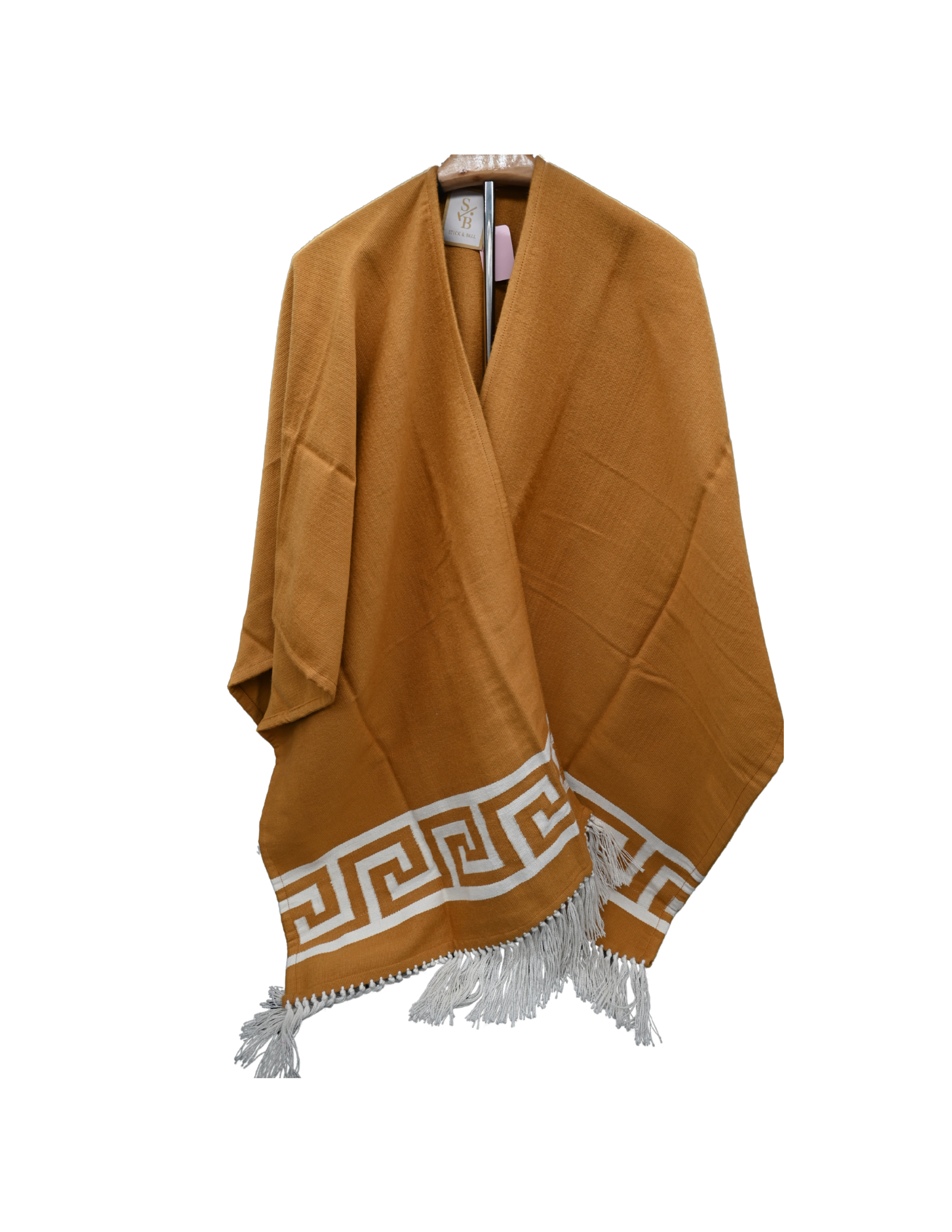 Handwoven from soft baby alpaca, this ruana features a rich gold hue accented by a traditional white geometric border motif. Lightweight yet warm, it drapes beautifully for effortless layering and timeless style. Each piece is thoughtfully crafted by artisans using traditional weaving techniques passed down through generations.